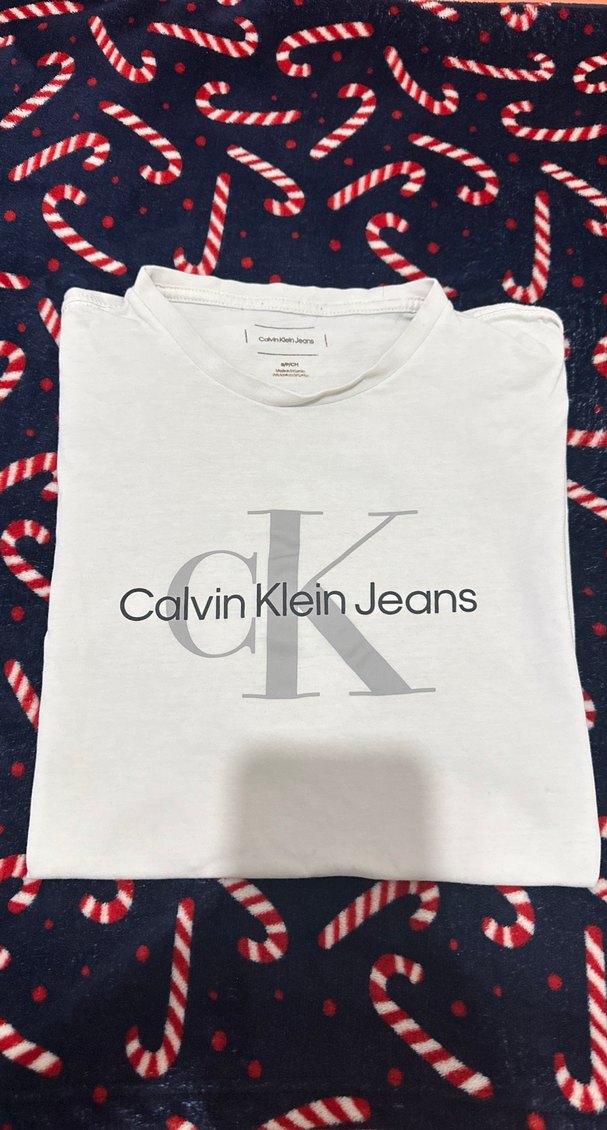 Orjinal Beyaz, kısa kollu, bisiklet yaka, Calvin Klein Jeans baskılı pamuklu pamuklu kumaştan erkek tişörtü. Rahat ve şık sokak tarzı için uygundur.