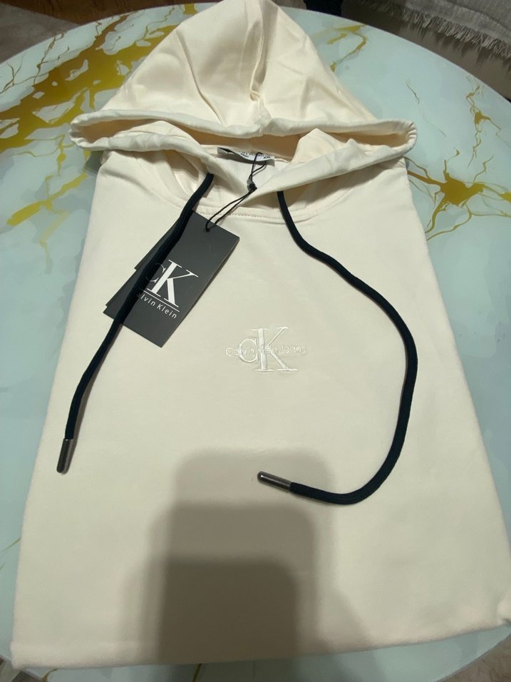 Beyaz renkte Calvin Klein kapüşonlu sweatshirt, yumuşak kumaş ve ayarlanabilir siyah iplerle rahat kullanım sunar. Her beden mevcuttur üst sekment bir üründür