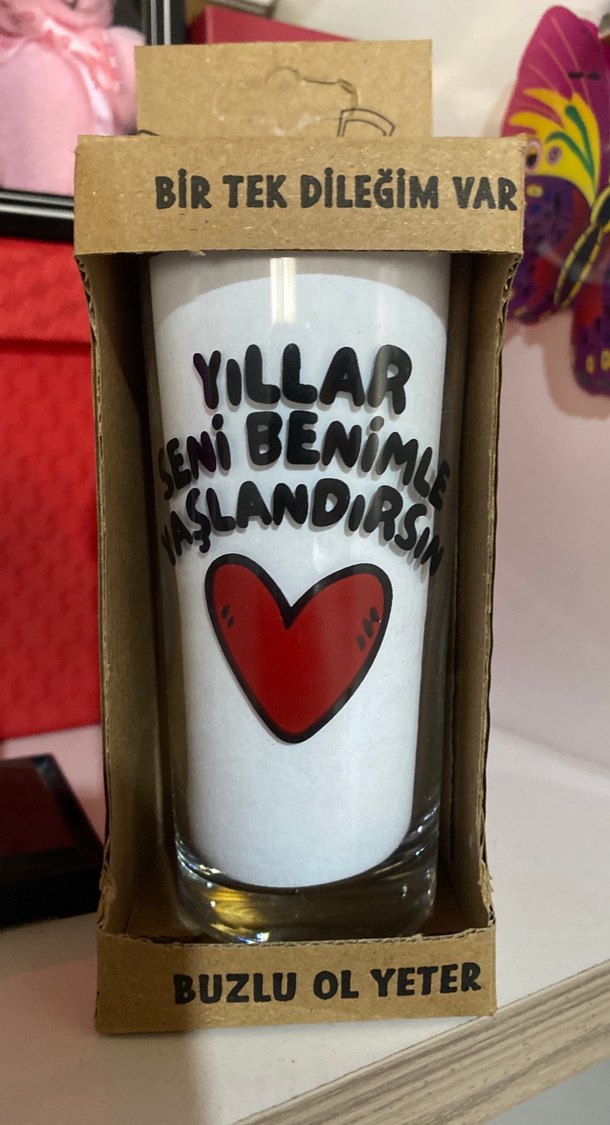 Üzerinde renkli kalp ve 'Yıllar seni benimle yaşlandırsın' yazılı beyaz cam bardak. Karton kutusunda, ek yazılarla birlikte. ❤️