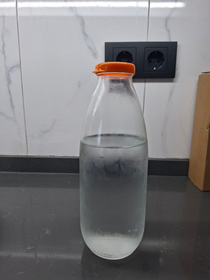 Turuncu kapaklı, beyaz camdan yapılmış bebek şişesi, kolay kullanım ve güvenli tasarıma sahip. Şeffaf yapısı içeriğin görünmesini sağlar.