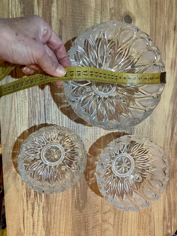 Bohem tarzda, açık renkli çiçek desenli üç adet farklı boyda tabak seti. İnce işçilikle tasarlanmıştır. Alman malıdır. En az 45 senelik. Ama yepyeni, tertemiz. Nostaljik Büyük boyu 400 TL Orta boyu. 320 TL Küçük boyu 250 TL 3 boyunu beraber almak isterseniz lütfen mesaj atınız. Takım da indirim yaparım.