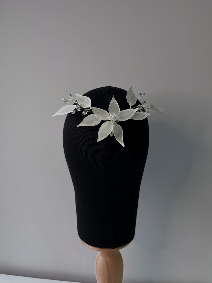 Beyaz cam yapraklar ve boncuk detaylarla süslenmiş, çiçek tasarımlı avant-garde saç aksesuarı. Trendsetterlar için çağdaş ve şık bir görünüm sunar.