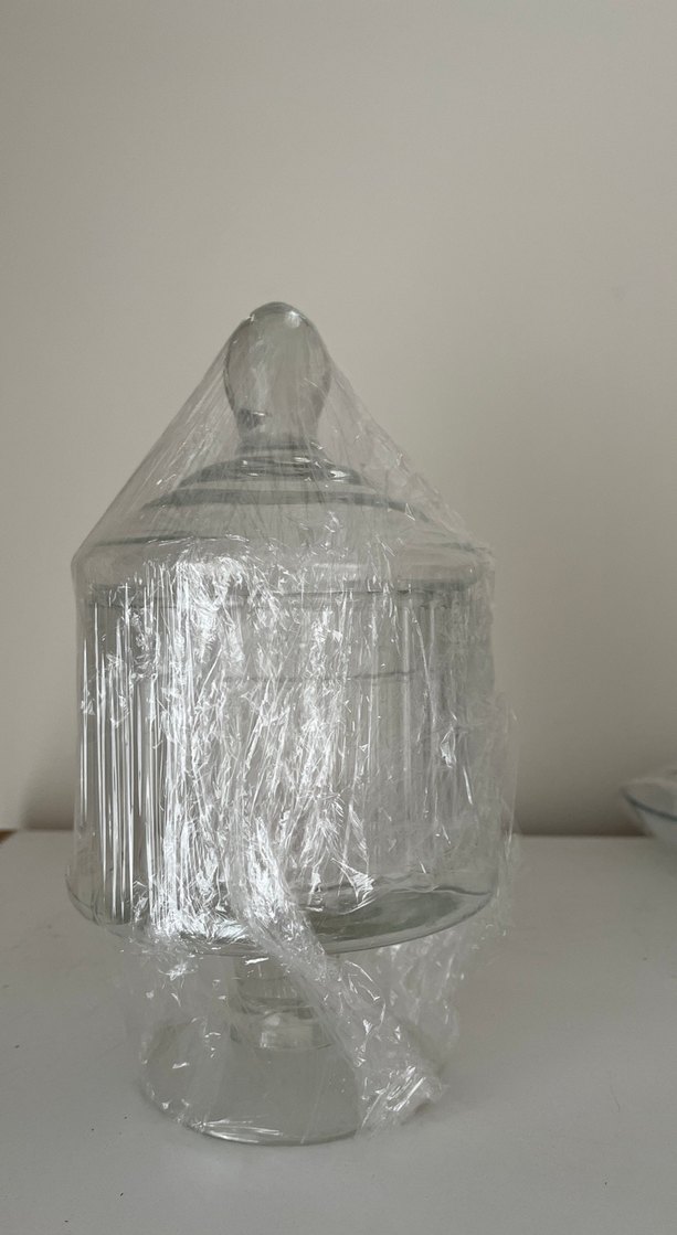 Beyaz camdan yapılmış, gri kapaklı ve streç filmle kaplanmış mutfak kabı. Mutfak eşyalarını saklamak için uygundur.