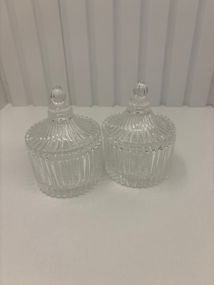 İki adet beyaz, kabartmalı cam küçük sunumluk, dekoratif kapaklı. Küçük eşyalar için uygun ve şık bir dekor ürünü. ️