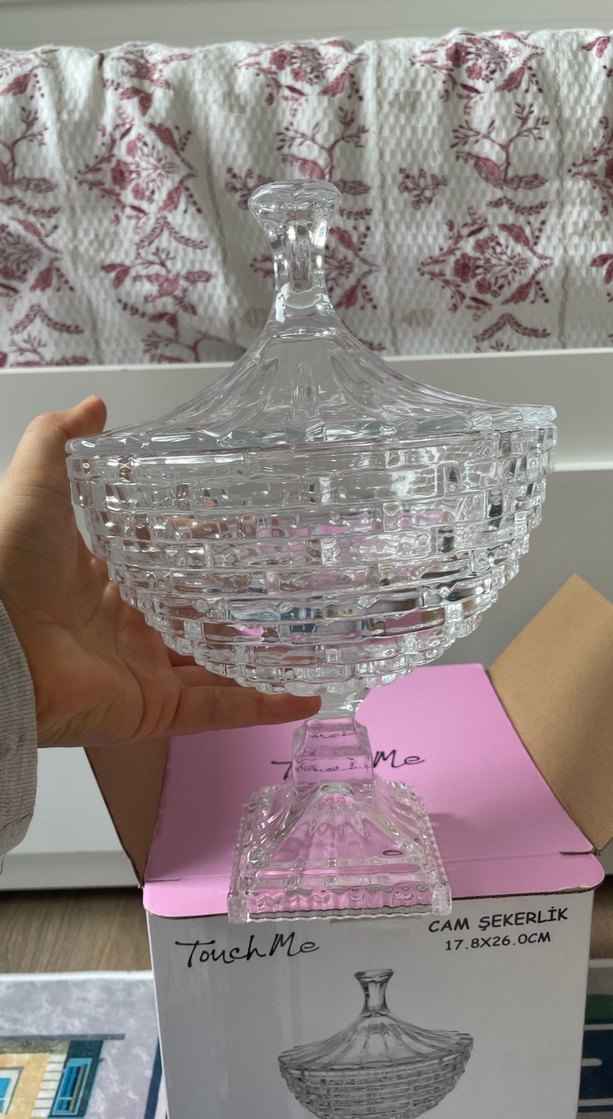 17.8x26 cm ölçülerinde, kapaklı beyaz cam şekerlik. TouchMe markasına ait dokulu tasarım. Hiç kullanılmamıştır