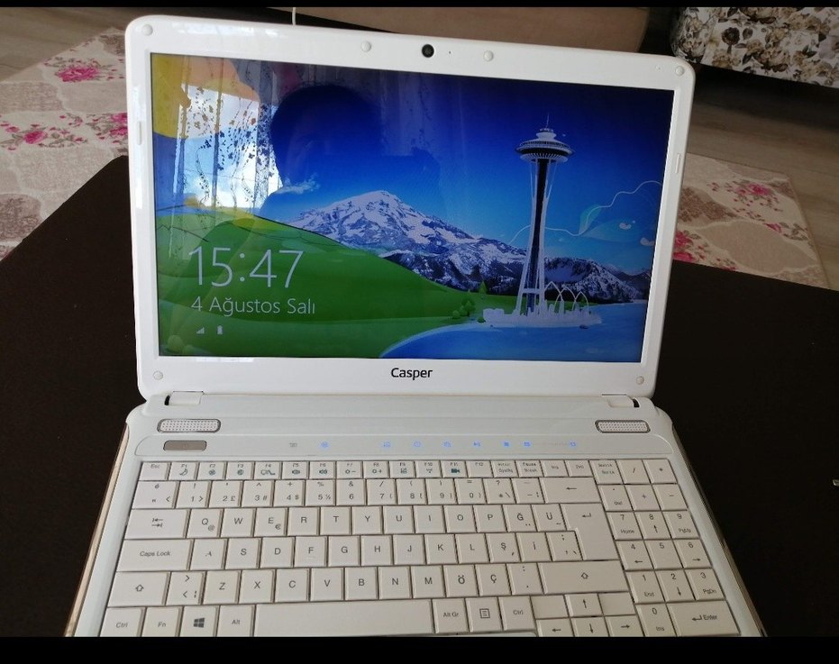 Beyaz Casper dizüstü bilgisayar, entegre web kamerası ve tam klavye ile. Hiç bir sorunu yok şarjı çantasıyla mause ile satilik.
