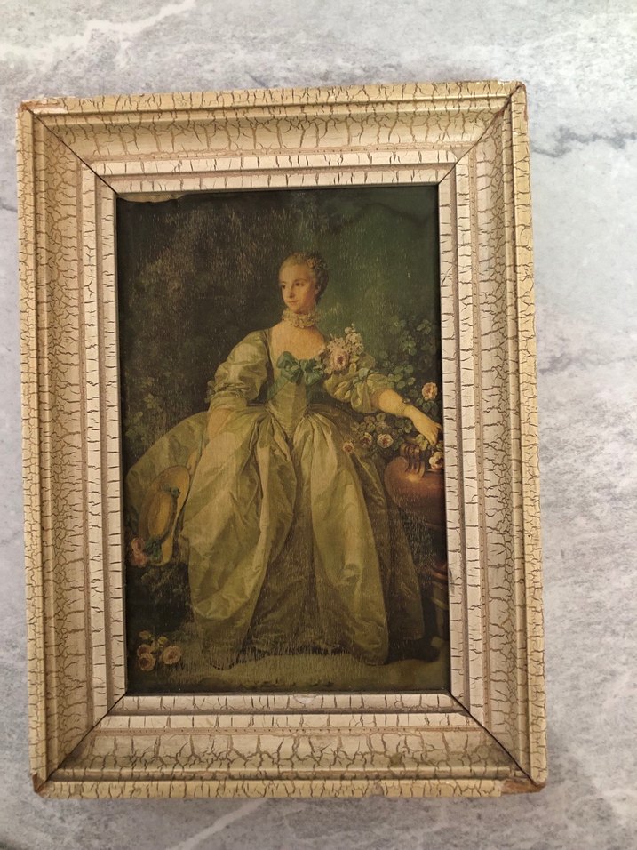 Vintage tarzda bir kadını betimleyen pastel tablo, çatlak desenli beyaz çerçeve içinde sunulmuştur. Klasik ve zarif bir görünüme sahiptir. Antikadır.