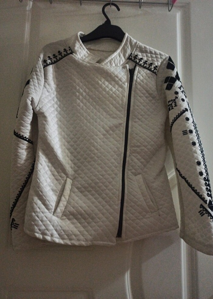 Beyaz kolları kilim desenli, fermuarlı, 38 beden. 1-2 kere kullandım. çok şık duruyor.