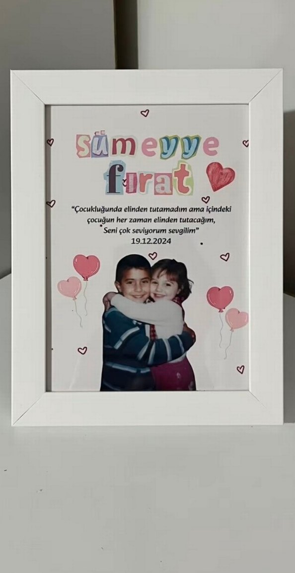 Beyaz çerçeve içinde, iki çocuğun sarıldığı çocukluk fotoğrafı ve sevgi dolu kişisel mesaj ile tarih yer alır. Renkli harflerle 'Sümeyye' ve 'Furat' isimleri yazılıdır. ❤️ Dilediğiniz şekilde tasarlanır