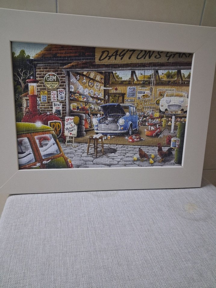Bu puzzle, beyaz çerçeve içinde eski model arabalar ve çeşitli tamir aletleriyle detaylı bir atölye sahnesi sunar. Gri ve beyaz tonlar canlı detaylarla birleşir.