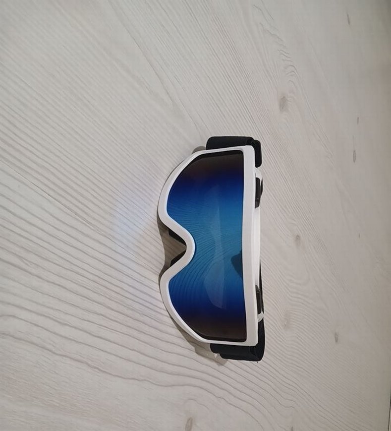 Beyaz plastik çerçeveli, mavi tonlu lenslere sahip gözlük Minimalist tasarım, tokalı kayış ile güvenli kullanım sağlar. kask gözlüğü olarak ta kullanılır