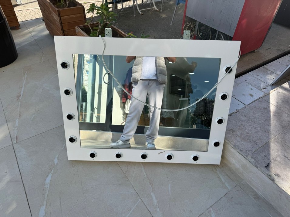Beyaz çerçeveli ve kenarlarında ışık bulunan ayna, makyaj veya giyinme için net ve parlak yansıtma sağlar.