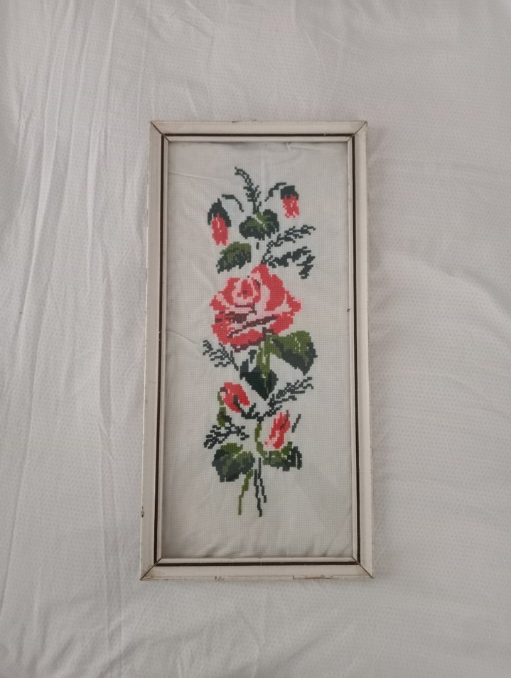 Beyaz arka plan üzerinde pembe gül ve yeşil yaprakların işlendiği, beyaz ahşap Çerçeveli antika nakış tablo.