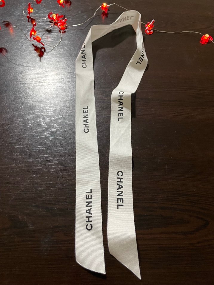Gri baskılı Chanel logolu beyaz yoga kayışı. Yumuşak ve dayanıklı kumaştan üretilmiştir.