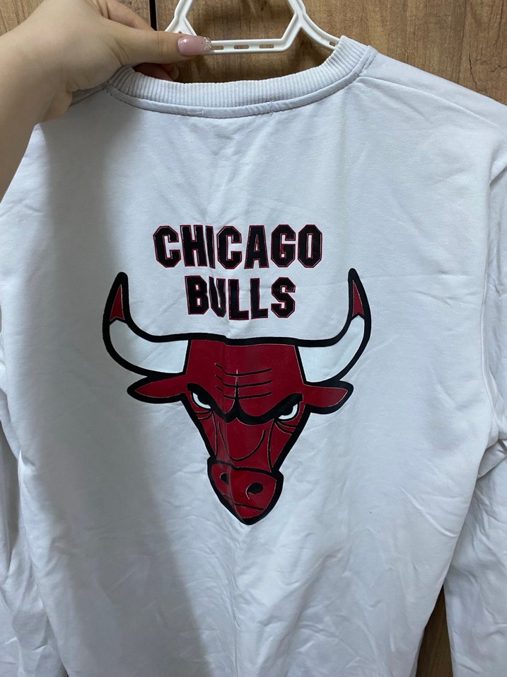 Pamuklu kumaştan, bisiklet yaka ve uzun kollu beyaz sweatshirt. Rahat kesim ve Chicago Bulls baskısıyla günlük, trend görünüme uygun.