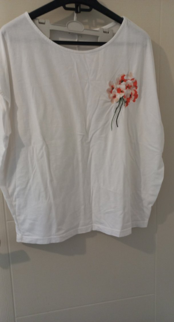 Pamuklu, uzun kollu, beyaz hamile tişörtü. Göğüs kısmında çiçek baskısı ve rahat oturan kesimi vardır.