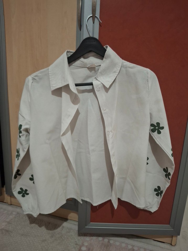 Bol kesim, uzun kollu beyaz keten gömlek, yakalı ve düğmeli. Kollarında yeşil çiçek baskıları bulunan günlük sokak stili gömlek.