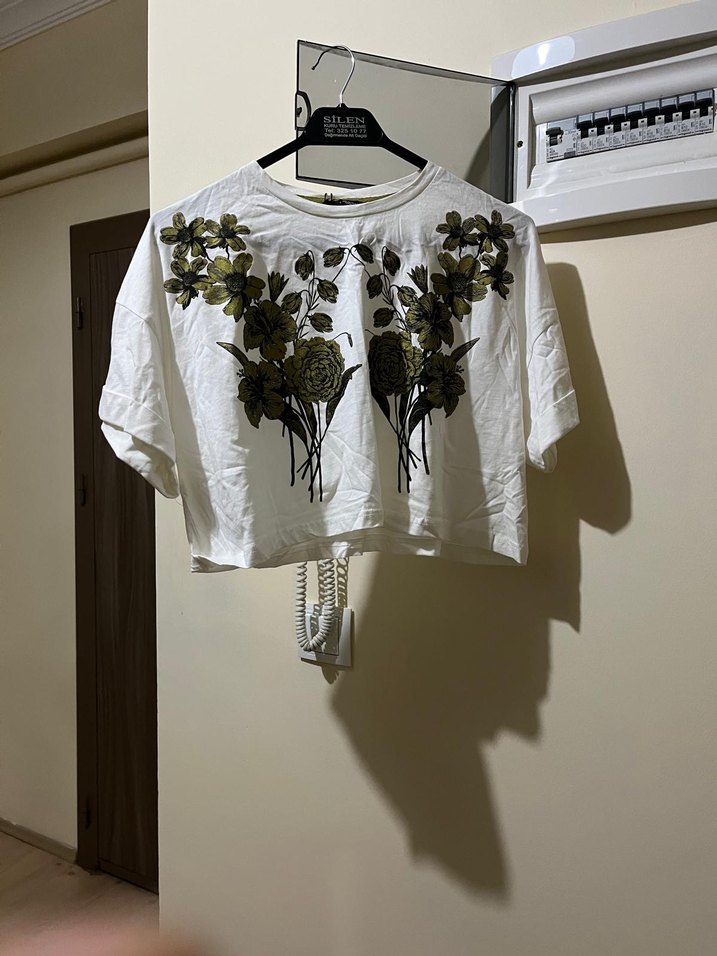 Pamuklu, beyaz, kısa kollu, bol kesim, mini uzunlukta ve önünde koyu renk çiçek baskısı olan tişört. Yuvarlak yaka ve sokak stiline uygun.