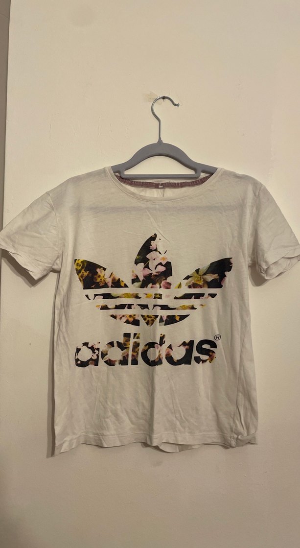 Beyaz, pamuklu, bol kesim kız tişörtü, önünde çiçek desenli Adidas baskısı ve yuvarlak yaka bulunur. biraz iç gösteriyor