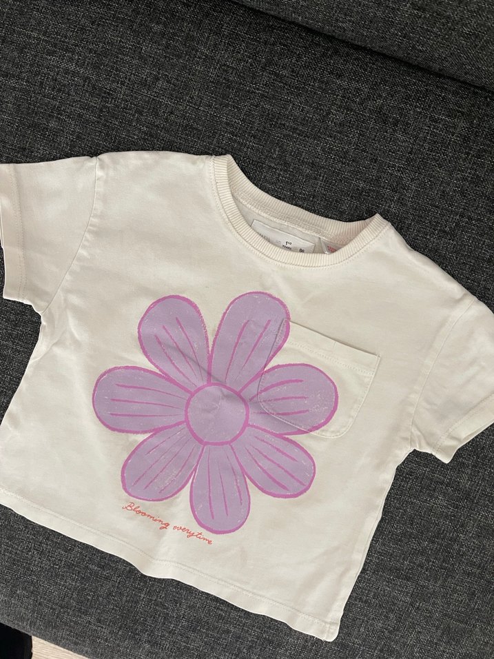 Yumuşak pamuklu, beyaz renkli kız tişörtü, kısa kollu ve bol kesim. Ön cepte büyük pastel mor çiçek baskısı bulunur.