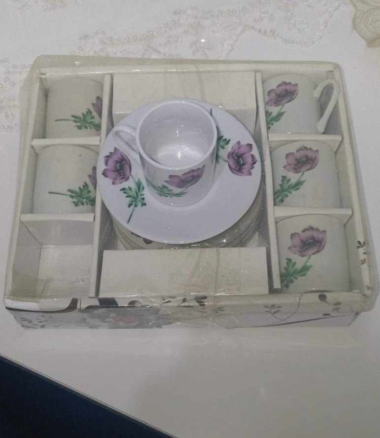 Beyaz zemin üzerine mor çiçek desenli, 6 adet kahve fincanı ve tabak seti. Klasik ve şık tasarıma sahiptir. ☕