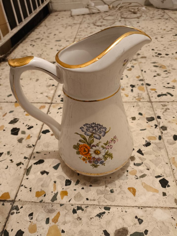 Beyaz çiçek desenli ve altın detaylı, kolay döküm için kıvrımlı kulp ve ağız yapısına sahip sürahi