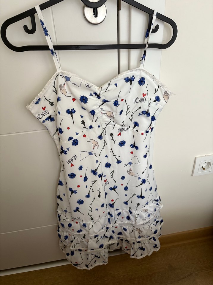 Askılı, straplez yaka ve çiçek desenli bu fitted midi elbise, etek kısmında fırfır detayları içerir. Hafif sentetik kumaştan üretilmiştir. Butikten aldım.