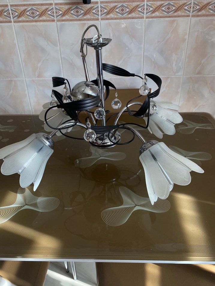 Beyaz çiçek şeklinde cam abajurları ve dekoratif kristal süslemeleri olan, kıvrımlı detaylı metal çerçeveli avize. Çok az kullanılmıştır. İhtiyaç fazlası olduğu için satıştadır.