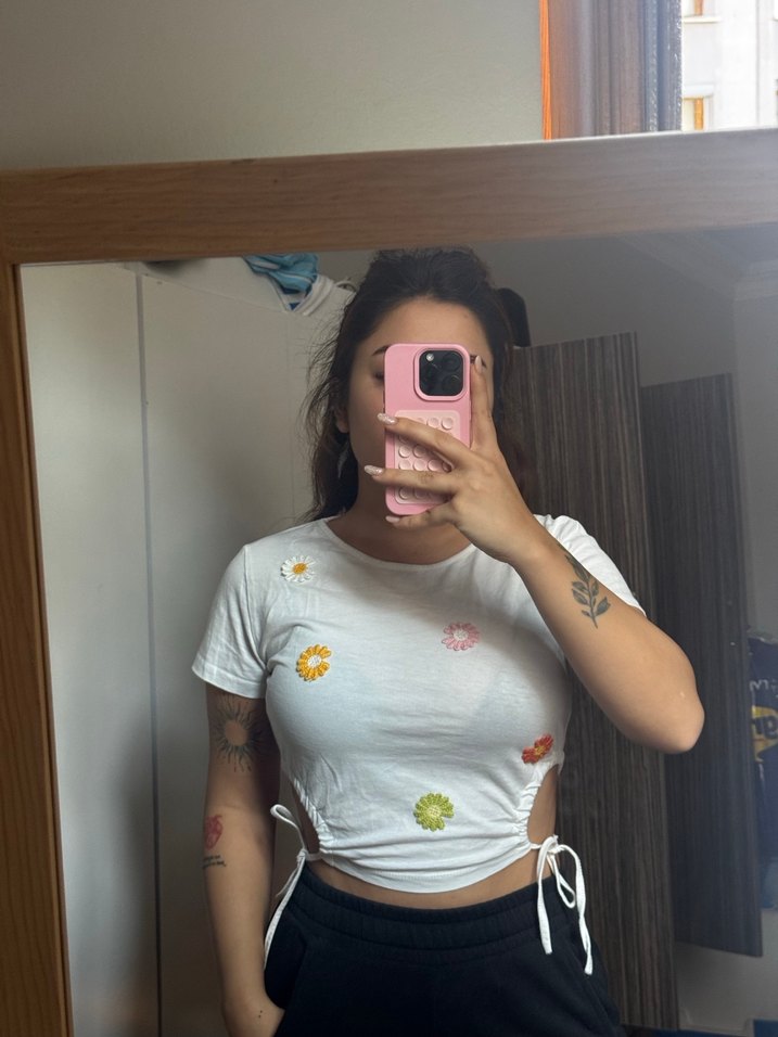 Kısa kollu, yuvarlak yaka beyaz crop top, renkli çiçek desenleri ve yan bağcıklı ayarlanabilir detaylara sahip. Yumuşak pamuk kumaş kullanılmış.
