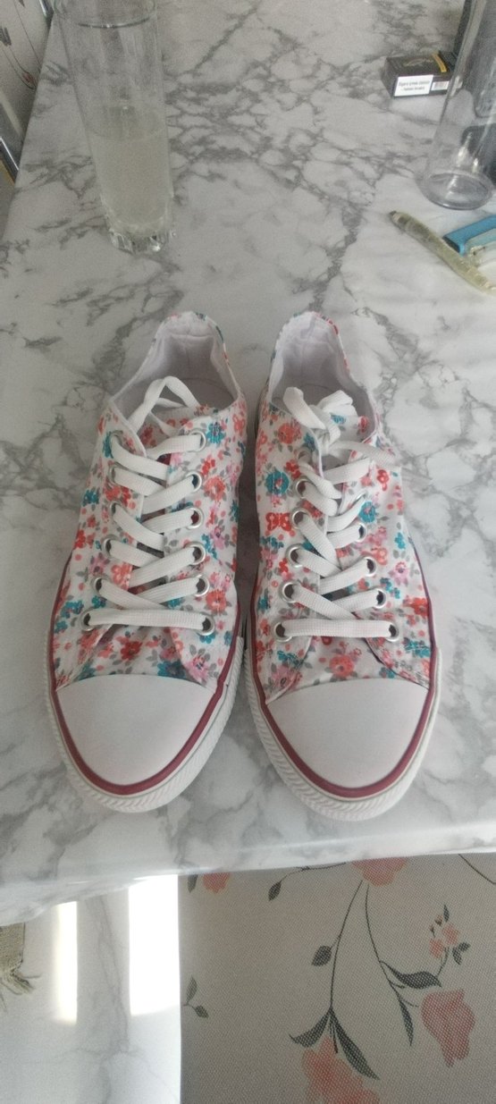 Sentetik kumaştan yapılmış, pastel çiçek desenli ve bağcıklı beyaz kadın spor ayakkabı. Yüksek topuklu, günlük kullanım için uygundur.