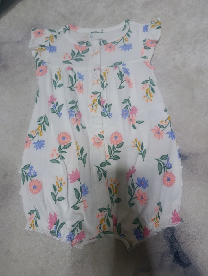 Bu bebek kız tulumu, beyaz kumaş üzerinde pastel çiçek desenleri ve kollarda fırfır detayları içerir. Yumuşak ve rahat bir kullanım sunar.