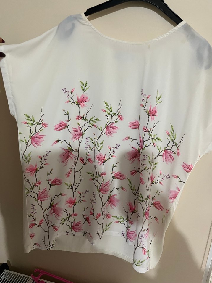 Beyaz renkte, bol kesim ve kısa boyda, drapeli kısa kollu bluz. V yakalı, pastel tonlarda çiçek desenli, bohem stile uygun.