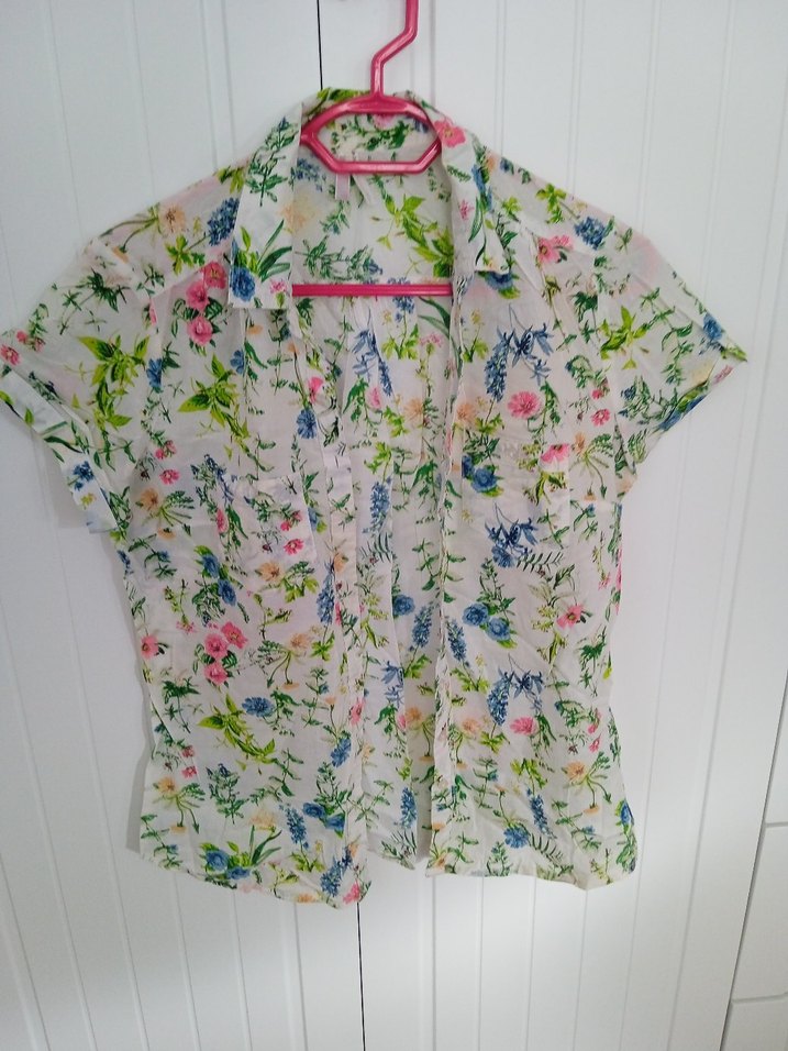 Beyaz gömlek, bol kesim, kısa kollu ve V yaka. Pastel çiçek desenli, düğmeli ön kısmı ile bohem tarzda açık hava kullanımı için uygun.