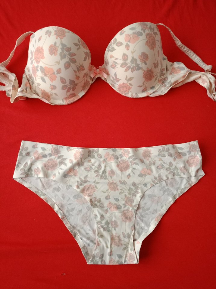 Hafif beyaz çiçek desenli, vintage bohem tarzda sütyen ve mini külot takımı. Sütyende ayarlanabilir askılar bulunur.