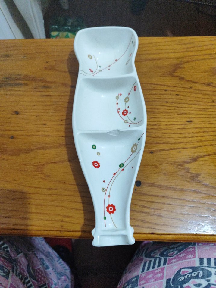 Beyaz renkli, üç bölmeli ve çiçek desenli yiyecek servis tabağıdır.bir yerinde hafif kırık var iyi inceleyin
