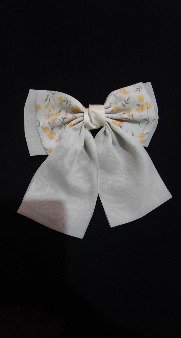 Yumuşak sentetik kumaştan, küçük çiçek desenli büyük beyaz fiyonk saç aksesuarı. Nostaljik Paris bohem tarzını yansıtıyor.