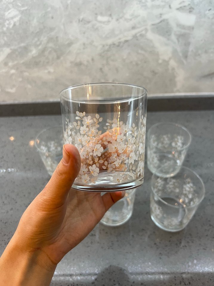 Şeffaf cam bardak, üzerinde zarif beyaz çiçek desenleri ile hafif ve şık bir tasarım sunar.