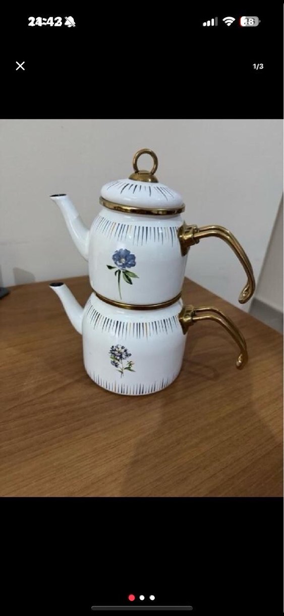 Altın renkli kulpları ve çiçek desenleri olan beyaz çaydanlık takımı. İki parçadan oluşur, şık ve hafif görünümlüdür.