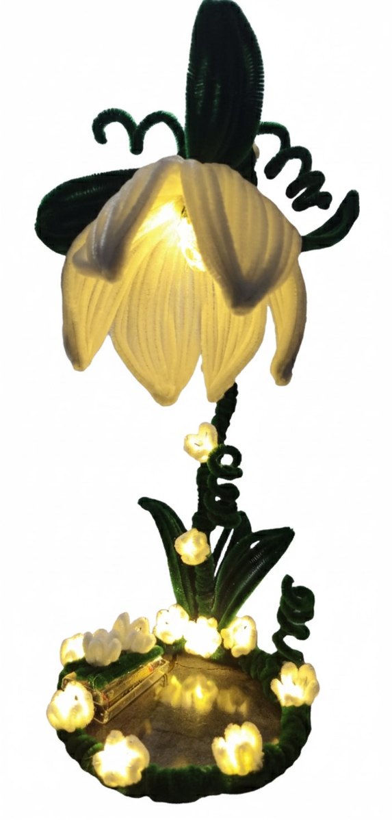 Beyaz çiçek şeklinde abajur ve ışık veren küçük çiçeklerle yeşil yaprakların bulunduğu dekoratif lamba.