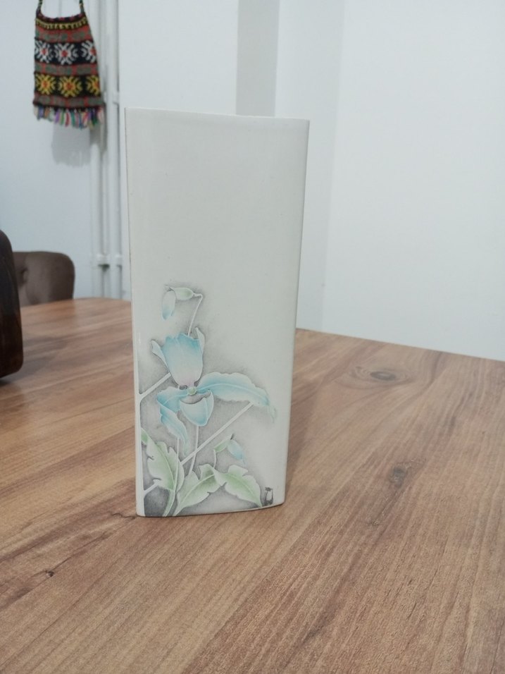 Bu beyaz vazo, yumuşak renklerde ince bir çiçek deseniyle dekoratif bir dokunuş sağlar. Dikdörtgen şekli modern bir görünüm sunar.