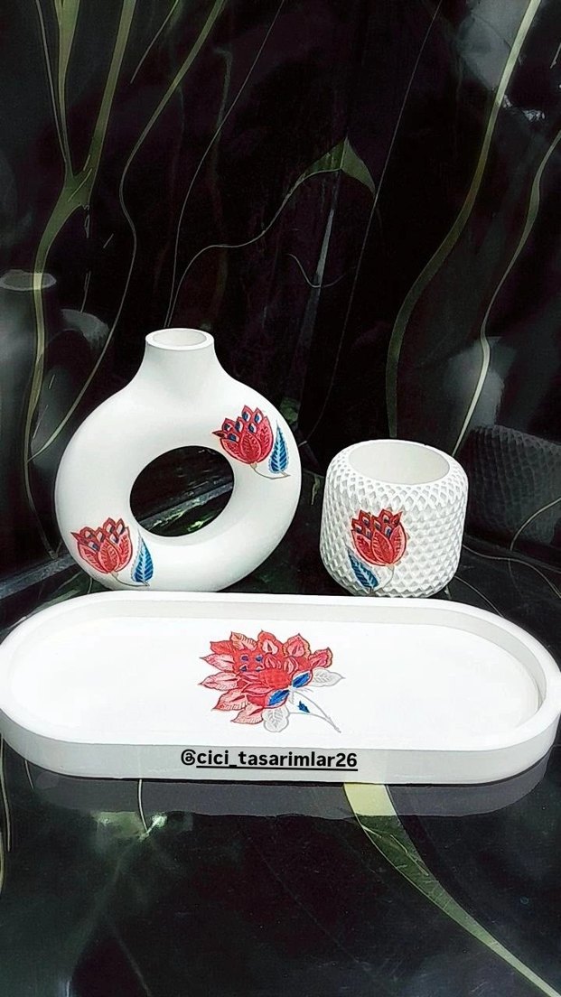 Çiçek desenli beyaz dekoratif vazo mumluk seti.Taş tozun'dan imal edilmiştir. Ortasında delik olan yuvarlak vazo, hasır mumluk ve uyumlu tepsi içerir.