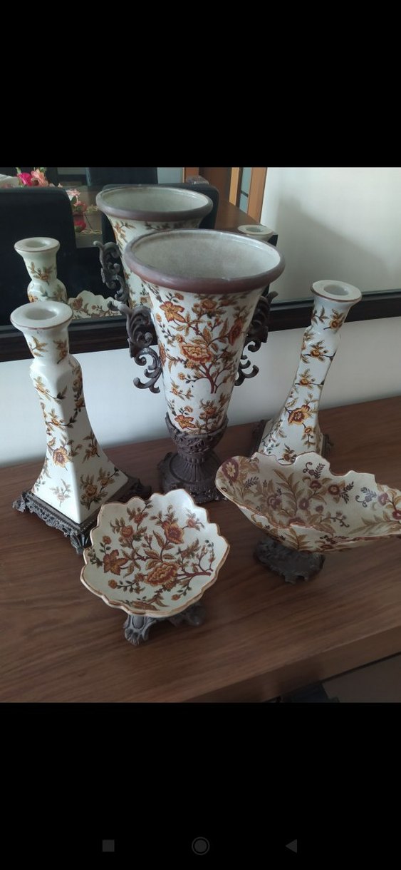 Beyaz tabanlı, detaylı çiçek desenlerine ve koyu renkli metal süslemelere sahip dekoratif vazo seti.