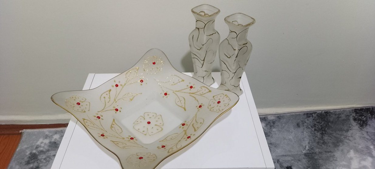 Beyaz dekoratif vazo ve uyumlu tabaktan oluşan set, kırmızı noktalar ve altın detaylarla süslenmiş çiçek desenlerine sahiptir. Vazo hafif ve zarif desenlidir.