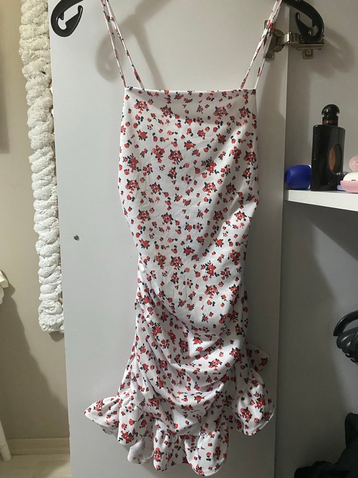 Drapeli ve askılı beyaz mini elbise, çiçek desenli, sentetik kumaştan, sokak modasına uygun şık bir tasarım.
