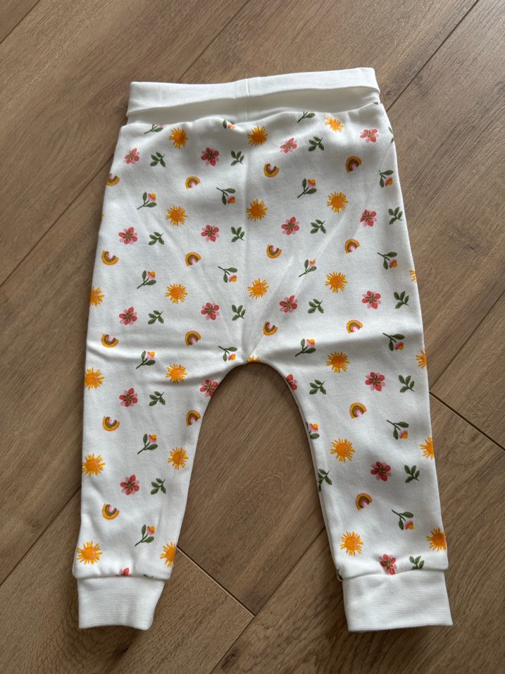 Beyaz pamuklu, gevşek kesim kız tayt. Pastel çiçek ve gökkuşağı desenleriyle düğmeli, bohem tarzda sokak giyimine uygun.