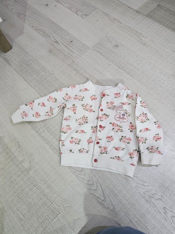 Beyaz renkte, çiçek desenli, düğmeli ve pamuklu kumaştan yapılmış, uzun kollu bol kesim kız hırkasıdır.