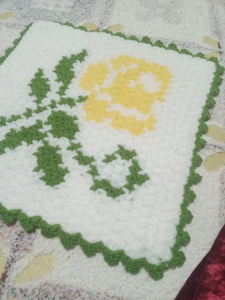 Sarılı sarı çiçek ve yeşil yaprak desenli beyaz el örgüsü banyo süngeri, yumuşak temizleme için dokulu yüzeye sahiptir.