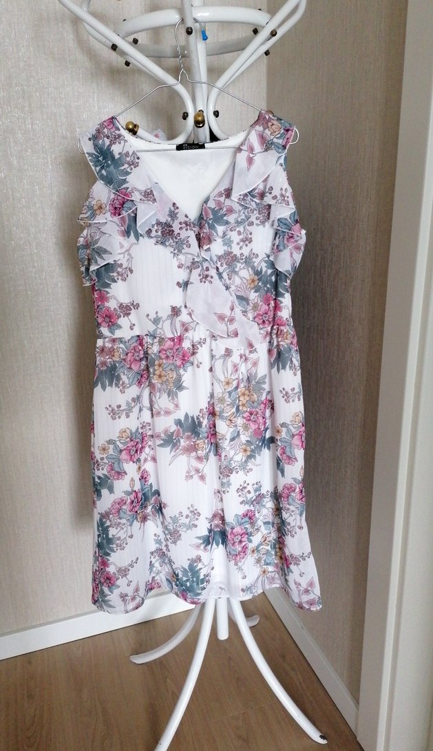 Askısız yakalı, fırfırlı, baskılı pastel çiçek desenli beyaz hamile elbisesi. Salaş kesim, günlük kullanım için uygundur. Boy 94 cm, kolaltı 47cm bel 42. Yandan fermuarlıdır. 1 veya 2 kez giydim hamileyken. Şifondur.Göbek kısmından rahattır