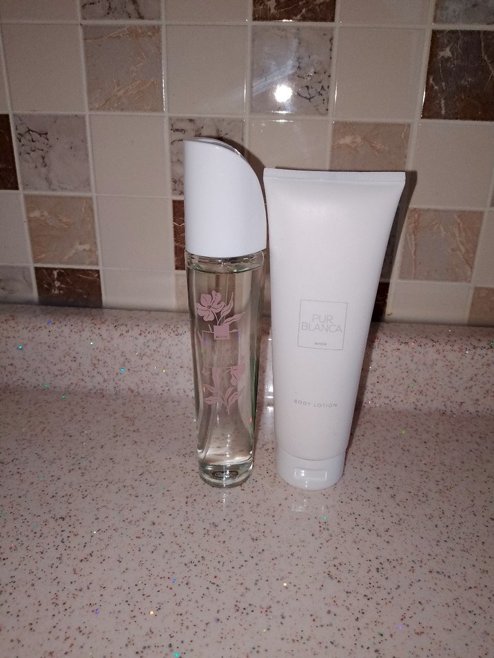 Şeffaf ve beyaz kapaklı, çiçek desenli kadın parfüm şişesi ile 'Pura Blanca' yazılı beyaz vücut losyonu tüpünden oluşan set.