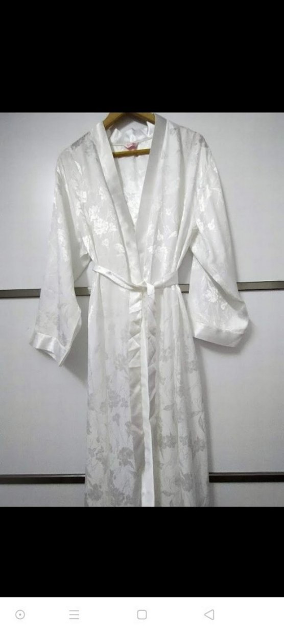 Beyaz renkli, çiçek desenli, uzun kollu ve bol kesim kadın gecelik sabahlık takımı Minimalist tarzda, uzun boyda ve klasik kesimlidir. hiç kullanılmadı. marka temsilidir